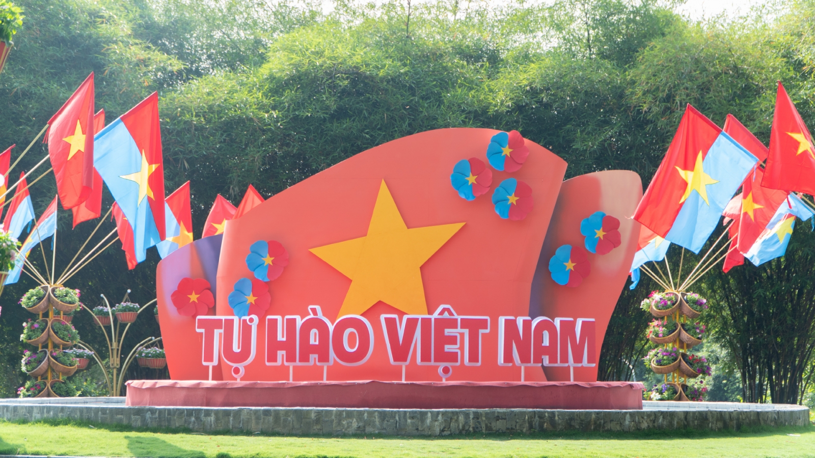 Đây chính là điểm "ăn tiền" nhất của công viên dịp lễ 30/04 này! Ngay khi đặt chân đến, bạn sẽ choáng ngợp bởi cổng chào được trang trí rực rỡ với dòng chữ "TỰ HÀO VIỆT NAM" và hàng loạt cờ đỏ sao vàng.